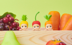 In this series, is wearing colorful fruit & veggie headgear and is climbing upwards in an adorable position!