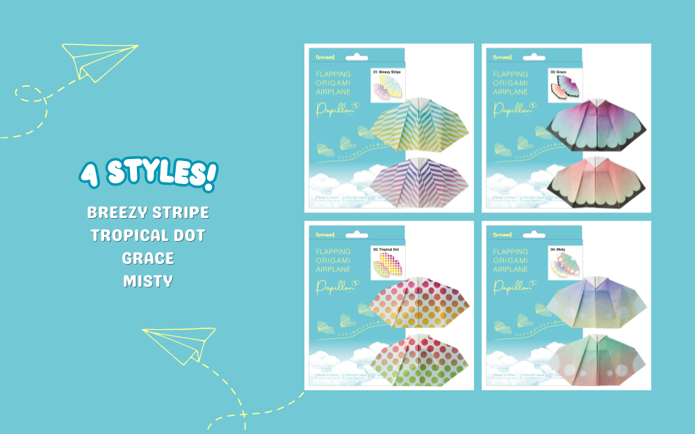 Reminiscent of butterflies, these fluttering paper airplanes come in four colorful designs. 2 Papillon airplanes come pre-folded in an origami style that requires minor adjustments to allow their wings to flap.